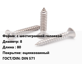 Саморез с шестигранной головкой D=8 L=80 оцинкованный ГОСТ: DIN 571