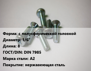 Винт с полусферической головкой 1/6"х8 DIN 7985 Сталь: A2 нержавеющая сталь