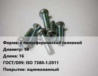 Винт с полусферической головкой 10х16 ISO 7380-1:2011 оцинкованный, 10.9, цена за шт, кг цена от 35.1 Тг / кг, где купить, условия доставки в Семее и Абайской области
