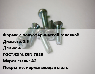 Винт с полусферической головкой 2.5х4 DIN 7985 Сталь: A2 нержавеющая сталь, цена за шт, кг цена от 3.15 Тг / кг, где купить, условия доставки в Семее и Абайской области