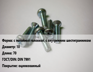 Винт с потайной головкой, с внутренним шестигранником 10х70 DIN 7991 оцинкованный, 10.9, цена за шт, кг цена от 18.38 Тг / кг, где купить, условия доставки в Семее и Абайской области