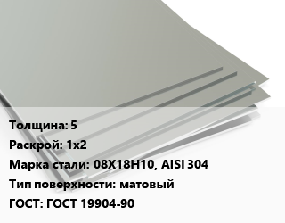 Лист нержавеющий 5 1х2 Сталь: 08Х18Н10, AISI 304 Тип:матовый ГОСТ 19904-90